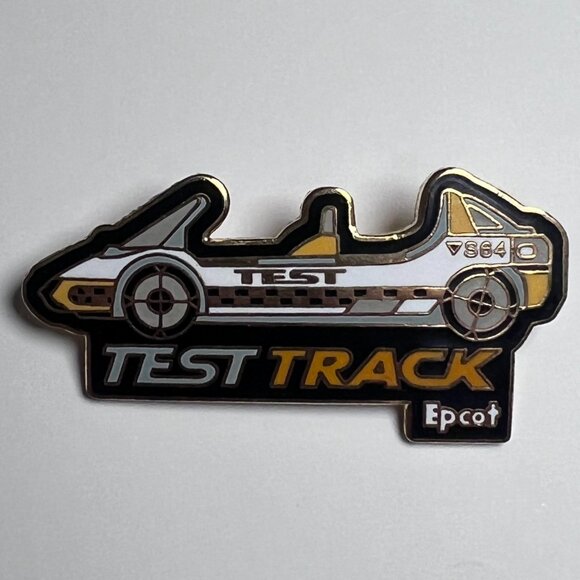 2001 version test track car pin — the white/yellow/black side-view ride vehicle with “TEST TRACK • EPCOT” along the bottom.