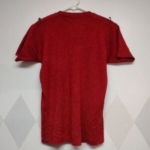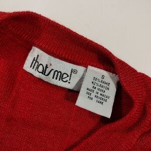that's me! red lightweight short sleeve sweater. Accent buttons on the shoulders. Decorative metal details on the front pockets. Red. Ramie rayon blend.