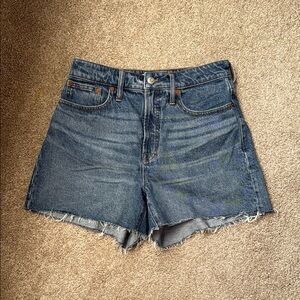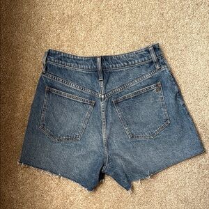 Classic blue raw hem denim shorts with a 4 inch inseam. Waist is 15 inches laying flat