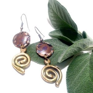silver post with mixed metal patina circle and gold swirl. handcrafted by local designer. approximately 2" long by .75" wide
