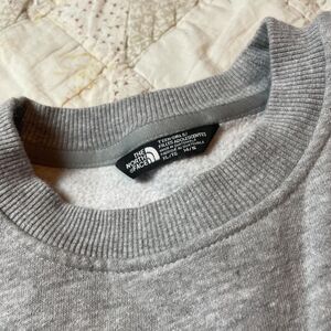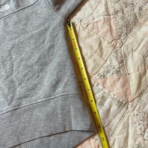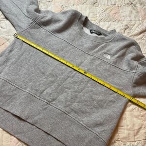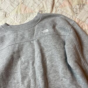 the north face cropped minimalist grey crewneck sweatshirt with white logo size kids xl but i wore it as a small see measurements. :)