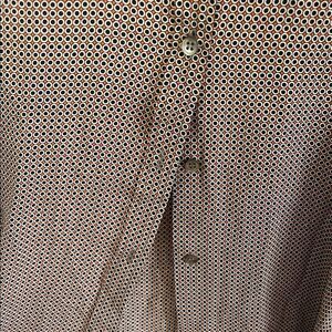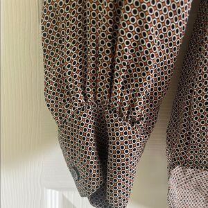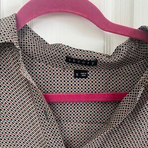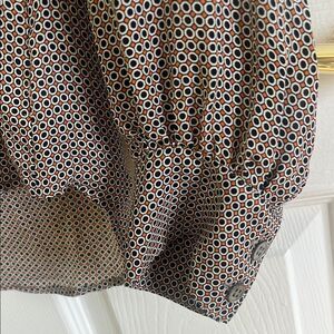 Stylish patterned button-up blouse. Features a classic collar and long sleeves. Perfect for any occasion.