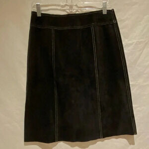 Black suede skirt from theory @ Bergdorf Goodman. Snaps completely up the front. White topstitching on front and back. New with original tags attached. Waist measures just under 31"; length is 23" from waist to bottom on front and 24" in back. Size 6.