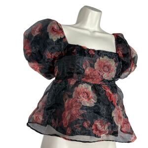 thirty / thirty LA Floral Crop Blouse Print Black Pink Top Sheer Scoop Neck - M