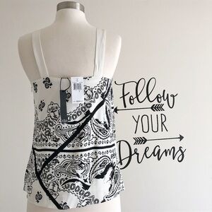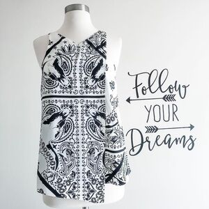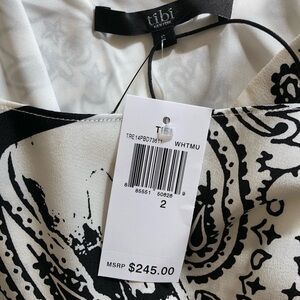 White and black silk Tibi sleeveless top with V-neck featuring overlapping shoulder straps at front, print throughout, overlapping front panel and concealed zip closure at side.