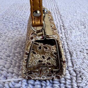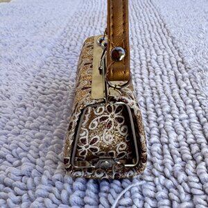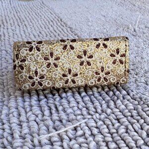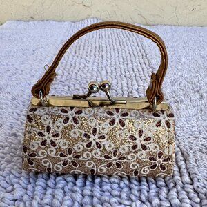 tic.tok Mini 4” Coin Purse or Lipstick Purse Glittery Gold and White Flowers Kiss Lock Clasp. Also great to use for gifting money. This adorable bag is in excellent condition. Please let me know if you have any questions.