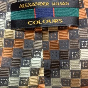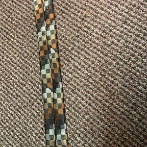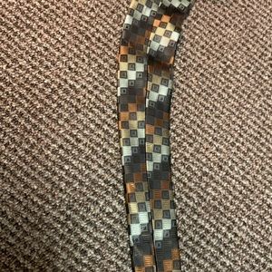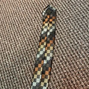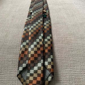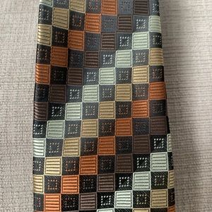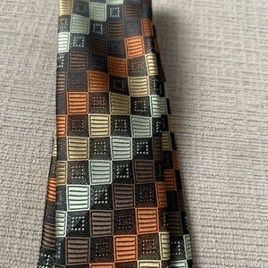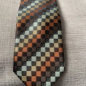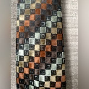 Diagonal striped necktie in brown, tan, beige black & rust with black square pattern.