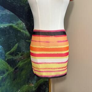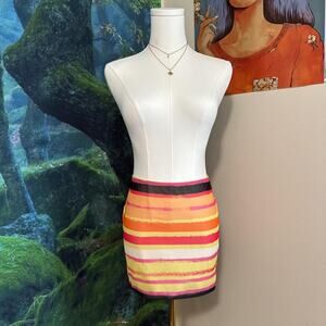 description: Vibrant multicolor striped mini skirt from Tiger Mist. Bodycon fit with stretch, perfect for summer nights or festival looks. Eye-catching color palette of pink, orange, yellow, and black with a painted stripe effect.