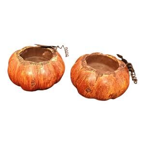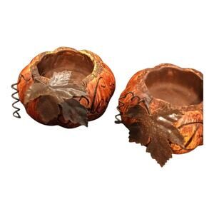The tii Collections Set Blessings Thanksgiving Resin Pumpkin Tin Leafs Candle Holder is a small, hand-painted candle holder featuring a pumpkin pattern in orange resin. This 1980s-style piece is suitable for any room and is perfect for the fall season, especially for Thanksgiving. With a set of 2 unboxed candle holders, this collectible item is a unique addition to any home decor. Clean with warm water to maintain its antique finish. Made in China, this original piece from tii Collections is sure to bring a festive touch to your furniture. Please review the photos, in very good condition.