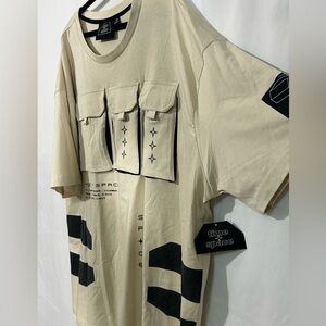 Tags: time and space, techwear, cargo pockets, utility tee, streetwear, graphic tee, oversized, 3XL, khaki tee, y2k tech, hype casual