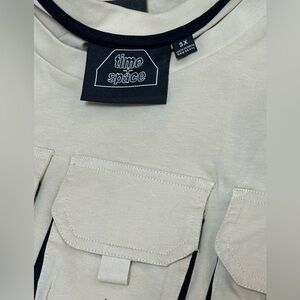 Street-meets-techwear! Oversized time + space short-sleeve tee in khaki with bold black graphics and three 3D flap “utility” pockets across the chest. Soft cotton jersey, crew neck, and that slouchy drape everyone wants. New with tags in 3X—perfect for relaxed, graphic-heavy fits.