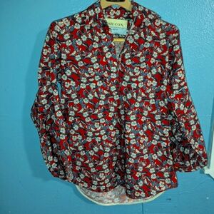 Stylish red button-up shirt with a floral pattern. Features white and black accents.