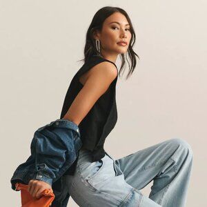 Your new “go with everything” black tank. By t.la (Urban Outfitters’ basics line), this sleeveless top features a soft, drapey jersey and a wrap/overlap asymmetrical front that hangs just right. Easy V-neck, relaxed fit, and lightweight stretch—perfect solo in warm weather or layered under blazers, cardis, and denim jackets year-round.
