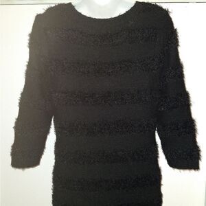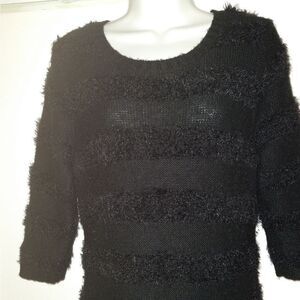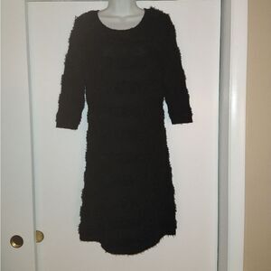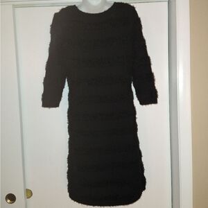 Black eyelash sweater dress. Fits just above the knee. 3/4 length sleeves. In very good pre-owned condition.