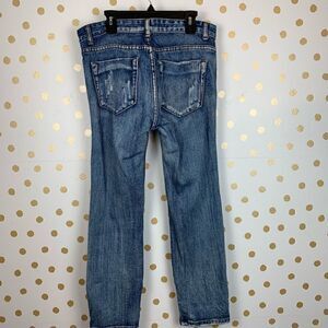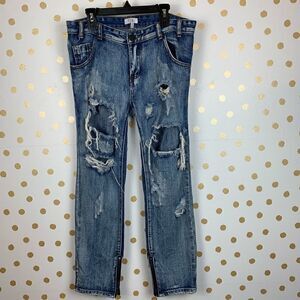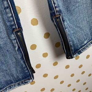 •Features: Medium wash distressed/destroyed skinny jeans with zipper detail at ankle