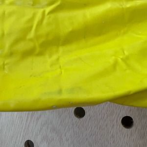 Flaws: has discoloration throughout as shown. small rip near neck string