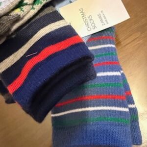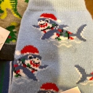 This is for 2 packages of 2 (4pr) of new crew socks for boys shoe size 6-7.5 They are labeled as Christmas socks but 2 of the pair are stripes and could be worn anytime. The other 2 pair are dinosaurs carrying gifts and sharks in christmas hats. I wear my regular christmas socks all year...because I like the designs. They are poly/spandex and machine washable. #boyssocks #toddlernoveltysocks #christmassocks #dinosaursocks #sharksocks