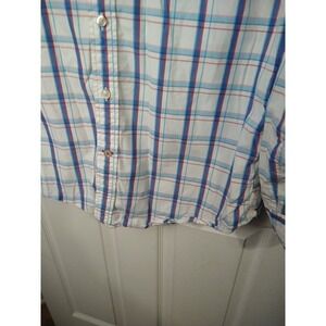 Tommy Hilfiger white blue teal red plaid collared button down shirt in good condition. Long sleeve adjustable button wrist. Rounded hemline.