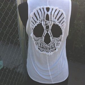 plain white in the front with cut out skull in the back, fits extra small to medium