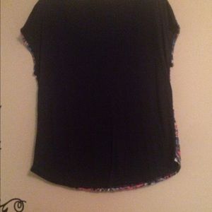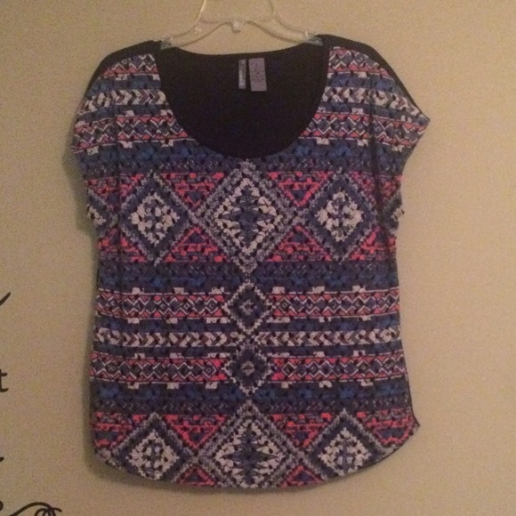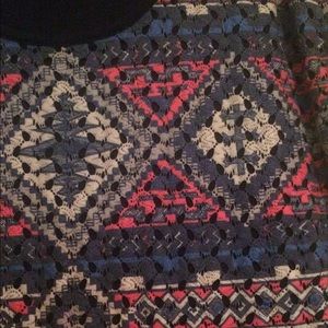 navy blue short sleeve shirt with pink, blue, and cream crochet on front.