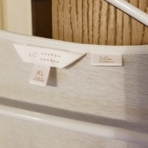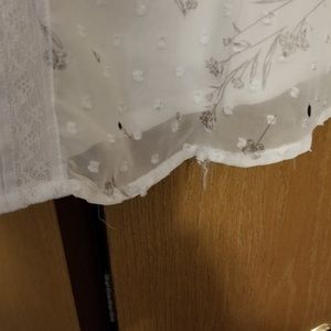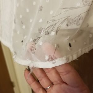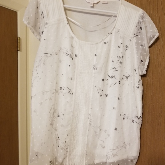 White top with grey flowers lovely top has sheen over lay. Loved item good shape, i would still wear but doesnt fit anymore. There arw some snags at bottom shown in pics above.