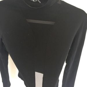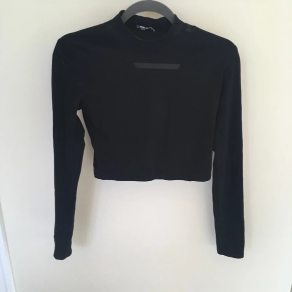 Black crop top that is sheer right down the middle as seen in the photo. The bac k is completely covered though.