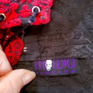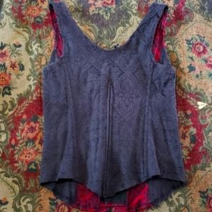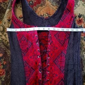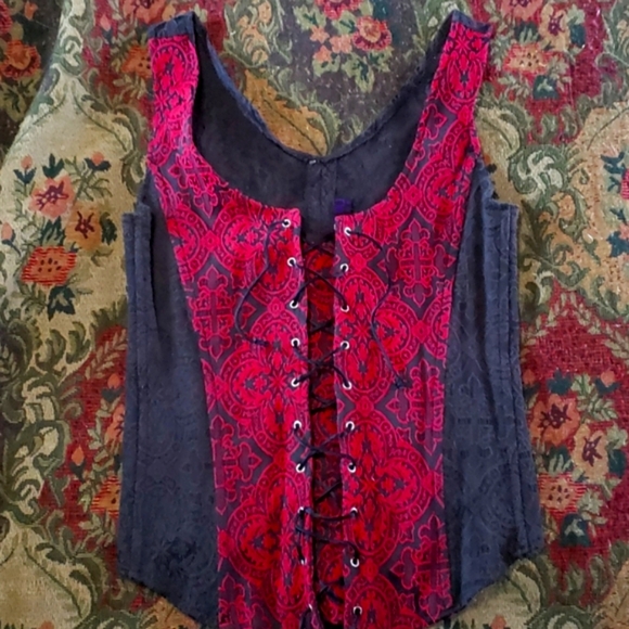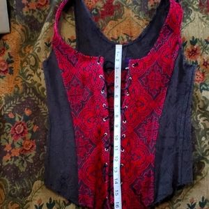 Beautiful stretchy top with zipper in back. I'd say a small-medium with the stretch. It is gorgious on. Worn once when i was smaller. In great shape. can't read the tag so took pic. Spandex and cotton blend i believe.