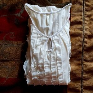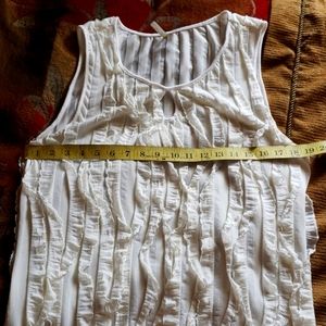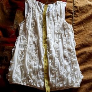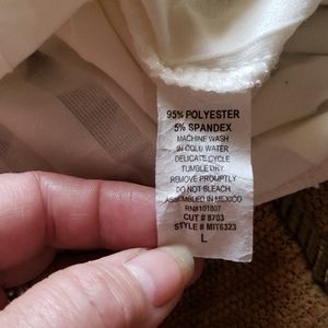 I call this my flutter angel wing top, flowy, with a teardrop opening in front. Has a elastic at bottom for better hold and positioning whether tucked in or left out. never able to wear after motorcycle accident and weight gain from meds. says large but Med. Would probably be best..But, thats just my opinion.