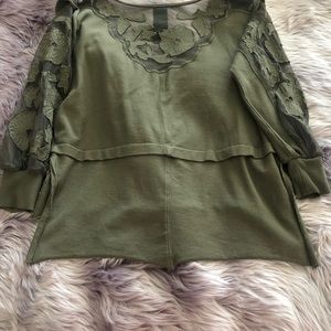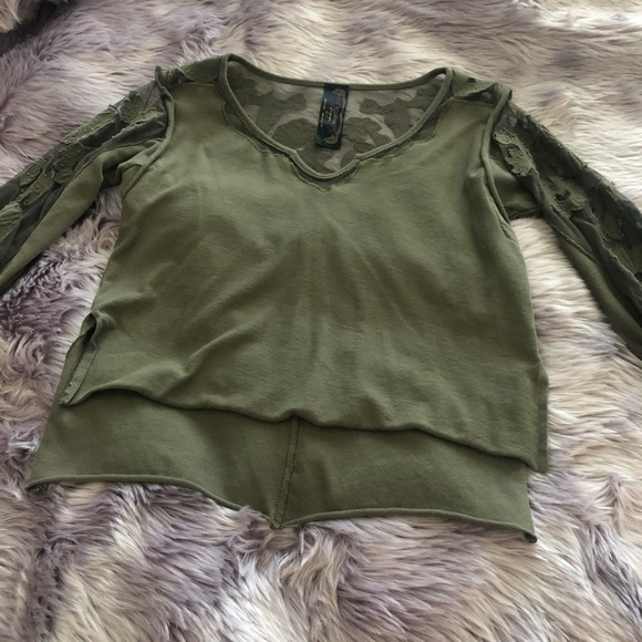 Army green top. Crops shorter in front , worn once , XS but fits bigger. beautiful see through mesh on sleeves