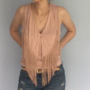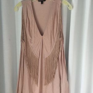 Fringe me, baby! This comfortable, unique top has a deep V neck and is embellished with a fringed overlay. It's long and can be worn out or tucked in.