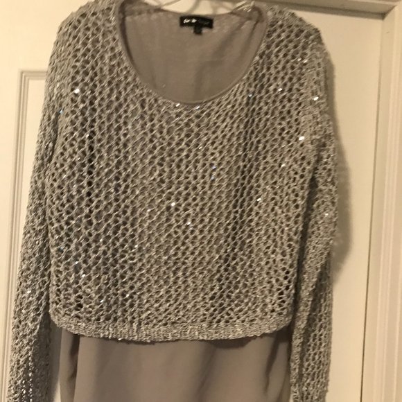 New, silver grey crochet over grey lining, with sequence. Caroline Morgan, size 12, purchased in Dublin, Ireland. Very nice, perfect for an evening.