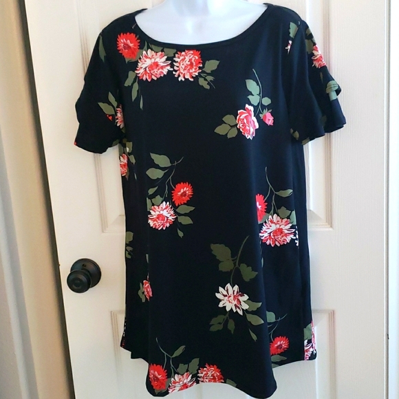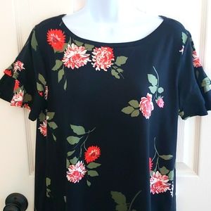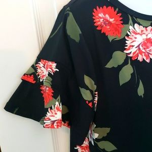 blouse with raffle sleeves, stretch clth material, one size, long that it hits below the hips