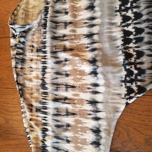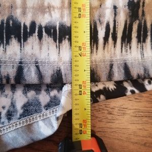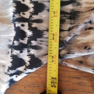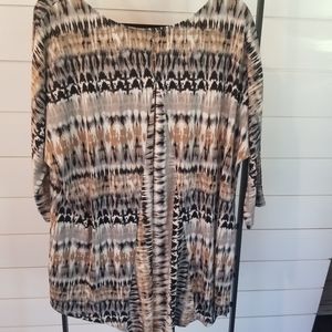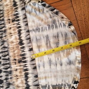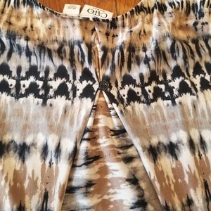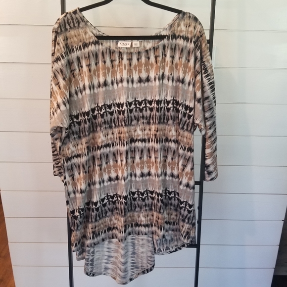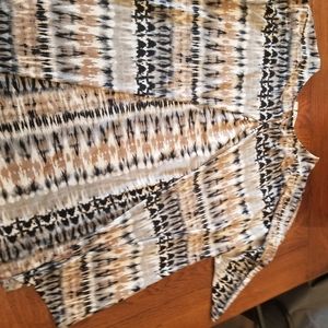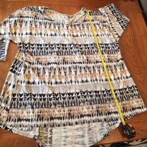 multi colored top, perfect for leggings, high/low hemline, dome sleeves, 3/4 length sleeve, pleated in back with buttom detail, back is 6 inches longer in length, measurements in pictures