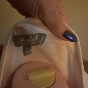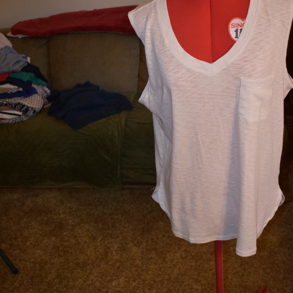 This is a white sleeveless top from Marbled. It has a v neck with one breast pocket and small slits at the bottom sides. It has a scooped bottom and pit to pit it is 20 inches and top shoulder to bottom it is 26 1/2 . It is 55% cotton, 38 modal and 3 elastine.