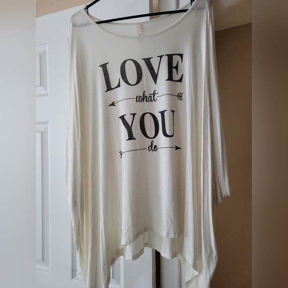 this is an oversize flowing style top. has short sleeves but with the style they go down the arms a little. it is semi see through buttery soft material