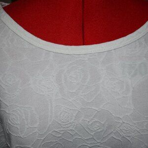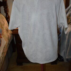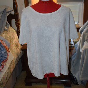 This is a creme short sleeve top from Rose and Olive. It is a size XL and has a rose pattern all over the top. It has a small scoop neck and is 97% polyester and 2% spandex. Pit to pit it is 25 inches and from the top of shoulder down it is 25 inches. It is new without tags.