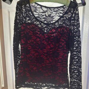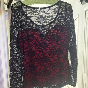 Black and red top, 60% Nylon / Polyamide 38% Polyester 2% Elastane / Spandex. Inner lining 100% Polyester. Light and breezy for those warmer evenings or day out