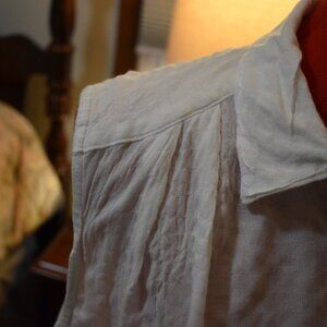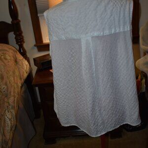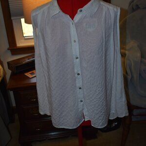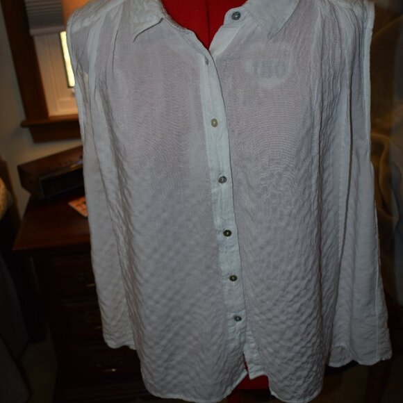 This is a sleeveless white top from Jane and Delancey. it is a size XL and buttons down the front. It has some gathering underneath the shoulders as seen in pictures. Also in the pictures facing front it looks long sleeve but that is just the flow and it is sleeveless. It is 98% rayon,23% spandex and pit to pit it is 25 inches and from the top of the shoulder down it measures 24 inches. It is new without tags.