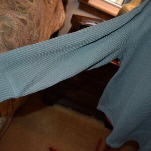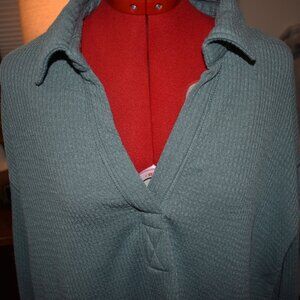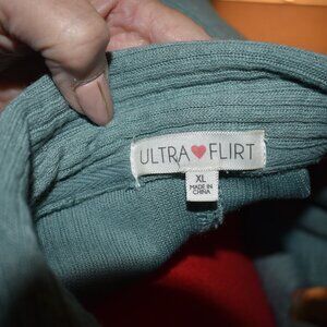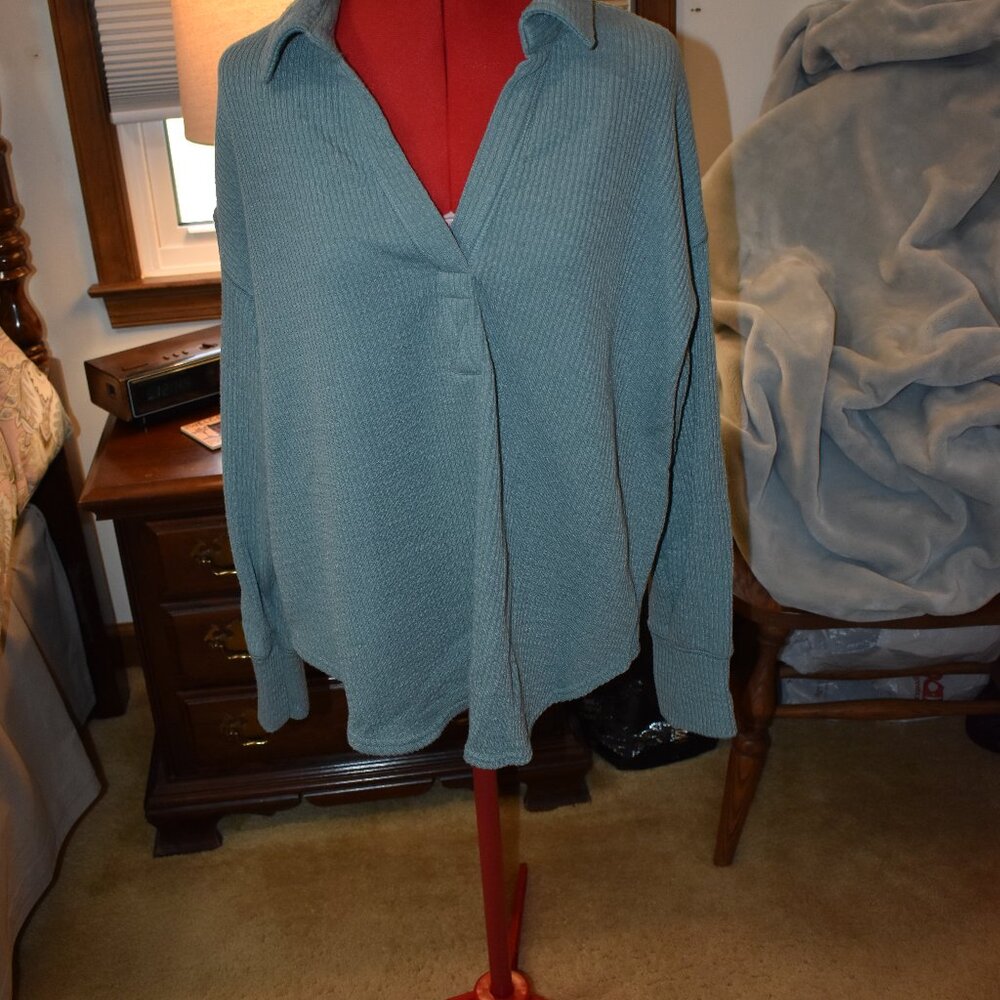 This is a long sleeve pull over top from Ultra Flirt in a size XL. It has a ribbed design and a deep V neck with a collar. It is a light med sage green in color. It has a scoop bottom and pit to pit it is 24 inches and from the top of the shoulder down it is 26 inches. Pit to pit it is 20 inches. It is 98% polyester and 2% spandex. It is gently worn and in great shape.