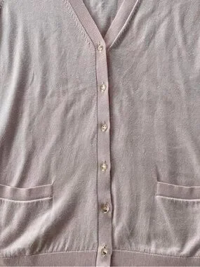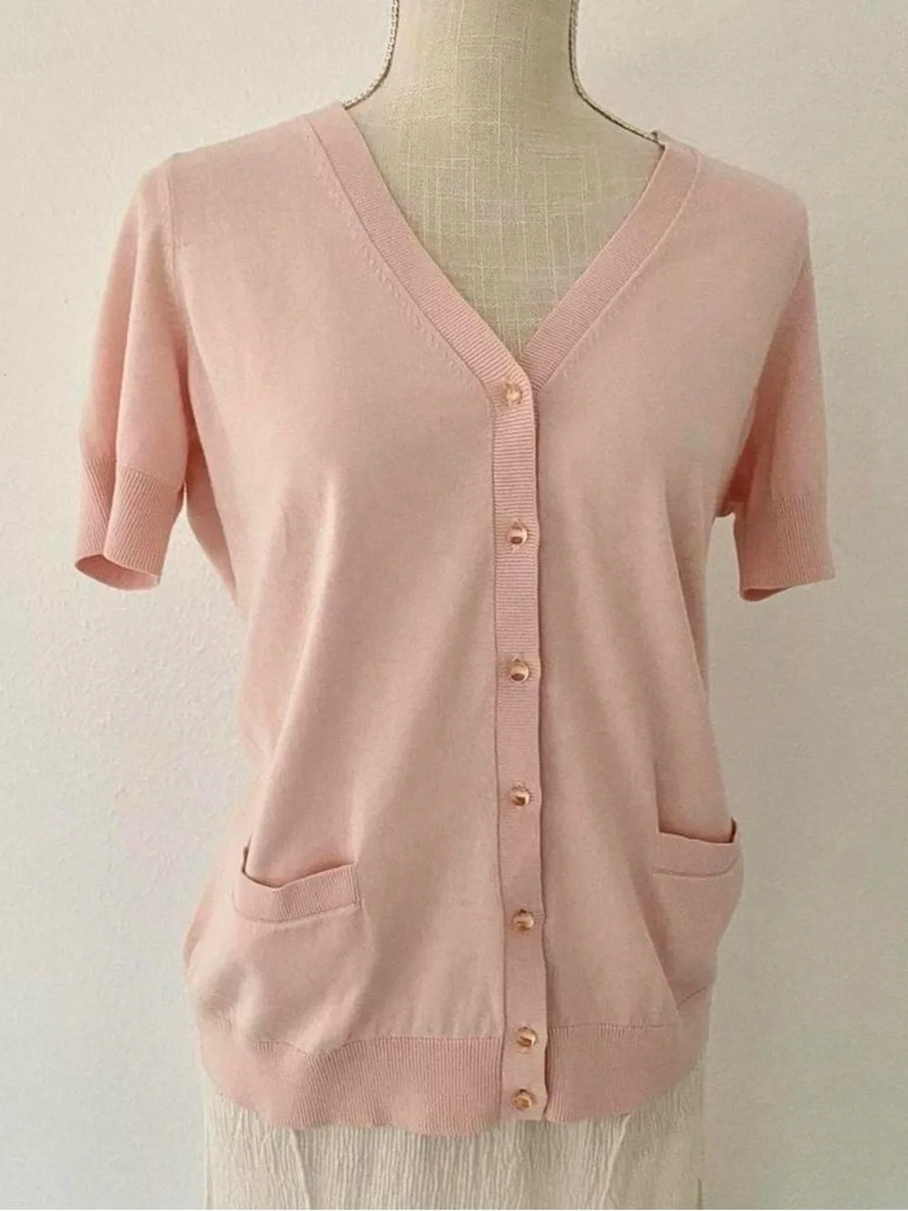 baby pink, v-neck cardigan, button-down, short sleeve, pocket detail, soft knit, pastel, feminine, casual chic, lightweight
