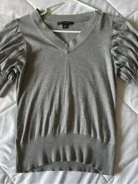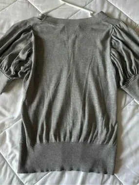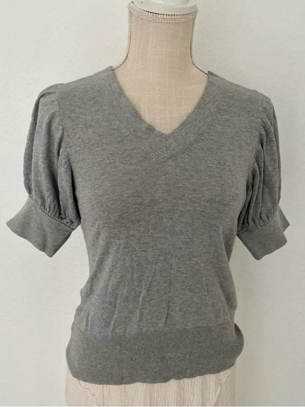 milkmaid style puff sleeve grey fitted v neck business work casual blouse. some light pink tint as shown but not noticeable at all.