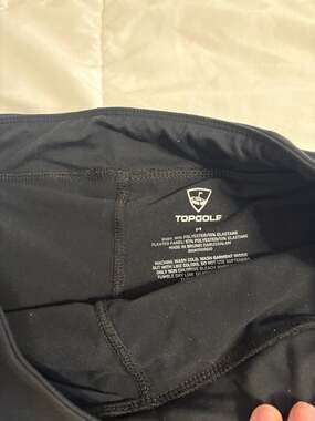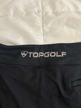 Topgolf Pleated Golf Skort, Black, Women's Size M — Sporty and functional. This black skort features a flattering pleated hem and functional pockets. Crafted from a high-performance polyester and elastane blend for stretch and comfort on the course. Features the Topgolf logo on the back waistband. Body: 90% Polyester, 10% Elastane. Pleated Panel: 87% Polyester, 13% Elastane. Good pre-owned condition with minor signs of wear and faint lint. No major flaws. Perfect for golf, tennis, or casual athletic wear.