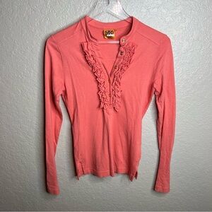 This top is in really good condition. It’s a great material and a great size. There is a stain underneath the ruffle part of the shirt that I did add a photo of and a little pulling in the back. I also did list a photo of.