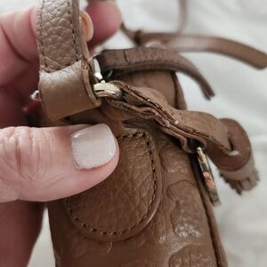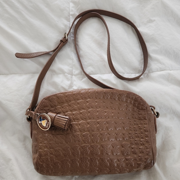 tous crossbody bag Brown Leather Bear Embossed , great for Travel , the last photo shows a little leather separation on the bag charm.