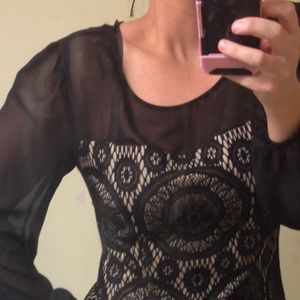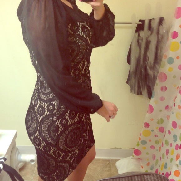 this black lace overlay dress with transparent chiffon black sleeves is gorg! it's sadly a reposh because it's too big. not in my hips, im a pear shaped girl! but the top is very loose and big on me unfortunately. makes me so sad because it's a super sexy dress! so great for a sexy look with more conservative details like the sleeves and no cleavage top! it's not short either, it's right above the knee! (I'm 5'3 tho) so cute, a must buy!!! jealous it doesn't fit ๐ข