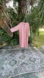 there are no tags on this piece. I believe it’s handmade. This is a very low pile, velvet or corduroy in the pink stripe and a soft glowing gold metallic gold stripe. The piece is a fairly heavier cotton, I believe. It is trimmed with a crochet trim and tinycrochet buttons all the way down the front. There are pockets. This is a lovely well-made piece traditional in styling in excellent condition.