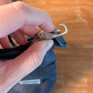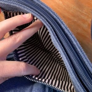 Travelon Heritage Collection Messenger Bag Purse Indigo Blue almost looks like jeans on the outside with cute stripes on the inside and brown/tan faux suede details. Almost like new condition, very minimal signs of wear, biggest flaw is the little flashlight inside does not work, I did not have the right size battery to try a new battery so I'm not sure if it's broken or just dead. Stylish and functional! 5-point anti-theft features include surround slash-resistant body panels and shoulder straps; locking compartments; lock down strap; and RFID blocking card and passport slots and pockets. The adjustable strap allows the bag to fit snuggly against your body. This purse is made to be water resistant. Measurements are approximately, width 10" and height 7"... strap drop 23"-26"... 95% cotton 5% polyester.