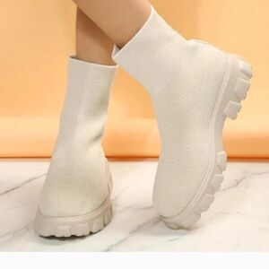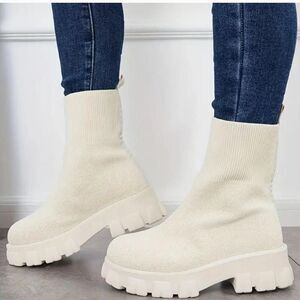 Women's Breathable Knit Platform Boots, Comfortable Slip On Socks Combat Boots, Fashion Chunky Heel Boots Beige white