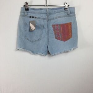 Forever21 tribal print studded distressed raw hem five pocket Jeans waist 14 1/2 inches rise 9 inches length 11 inches also has studs above One back pocket and the other back pocket has tribal print size 26
