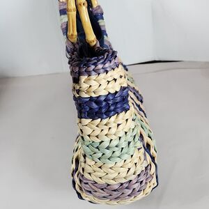 tropical trends purple striped colorful Straw Woven Handbag round Bamboo Handle. Condition is Pre-owned. Shipped with USPS Ground Advantage.